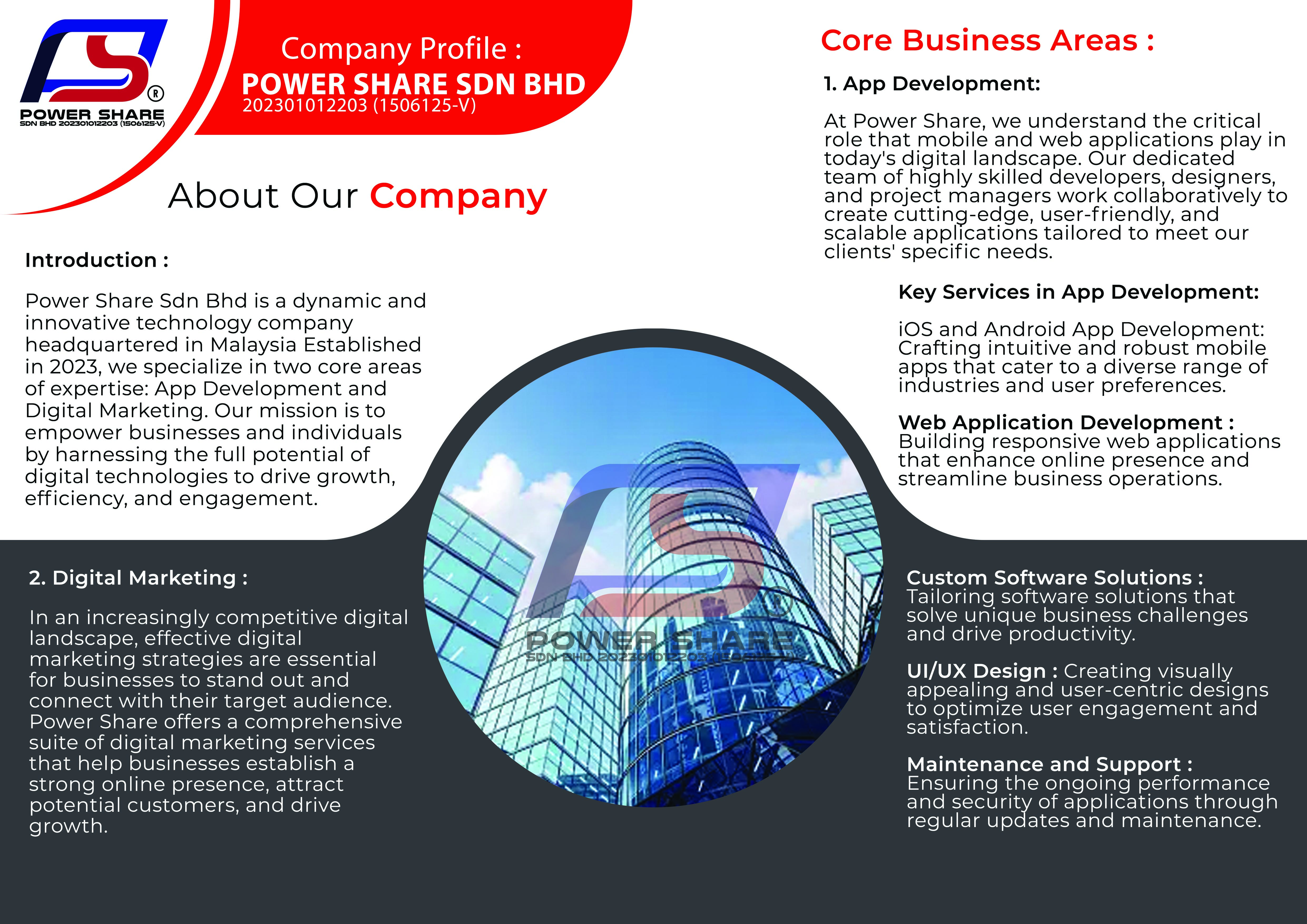 Power Share Sdn Bhd ialah sebuah syarikat teknologi dinamik dan inovatif yang beribu pejabat di Malaysia Ditubuhkan pada 2023, kami mengkhusus dalam tiga bidang teras kepakaran iaitu Pembangunan Aplikasi dan Pemasaran Digital. Misi kami adalah untuk memperkasakan perniagaan dan individu dengan memanfaatkan potensi penuh teknologi digital untuk memacu pertumbuhan, kecekapan dan penglibatan.